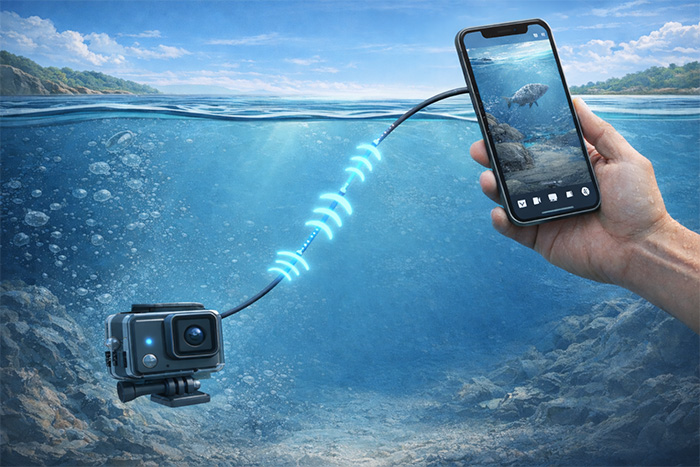 Wi-Fi 和蓝牙在水下无法工作,因为水会吸收无线电信号,导致水下无线传输不稳定。虽然运动相机可以录制水下视频,但实时查看需要采用不同的方法。